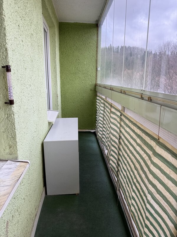 umístěn do 2.patra s výhledem na dětské hřiště za domem. Je vybaven
