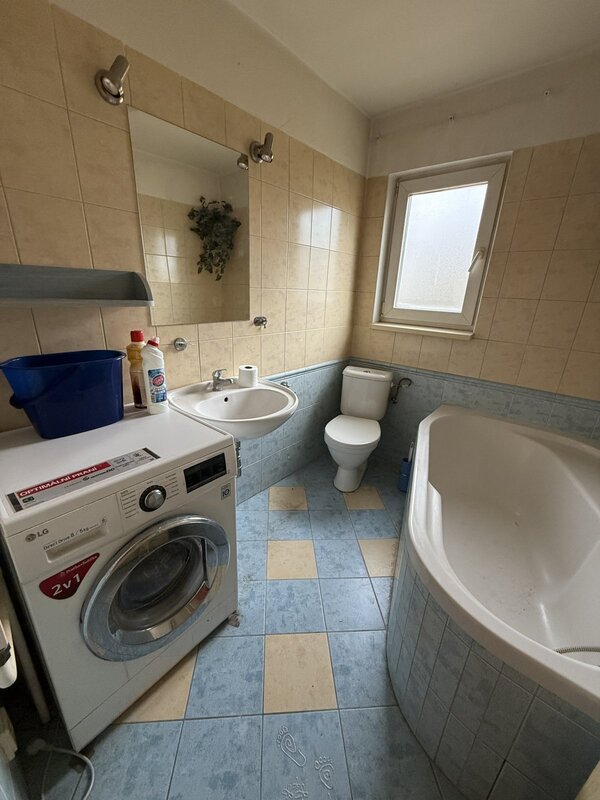 Podlahy ve všech pokojích jsou pokryty dřevěnými parketami. Koupelna obklad
