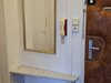 skříňky se zrcadly, rohová police. Na podlaze mramorová dlažba, který