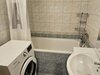 Koupelna s vanou, koupelnovou skříňkou a pračkou. WC je samostatné.